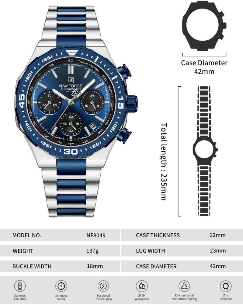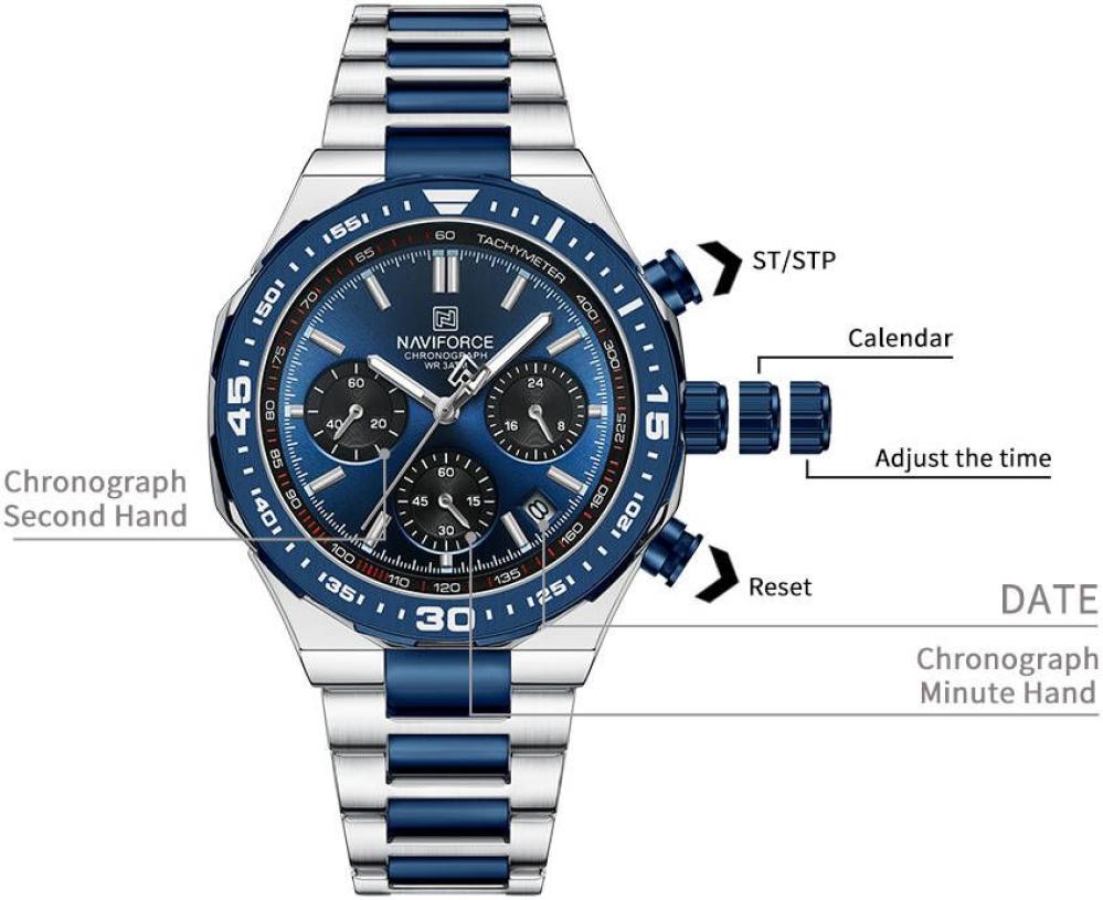• ساعة Naviforce هي ساعة يد رجالية أنيقة وهي أكثر من مجرد أداة لحفظ الوقت؛ إنه انعكاس لموقف نمط الحياة.