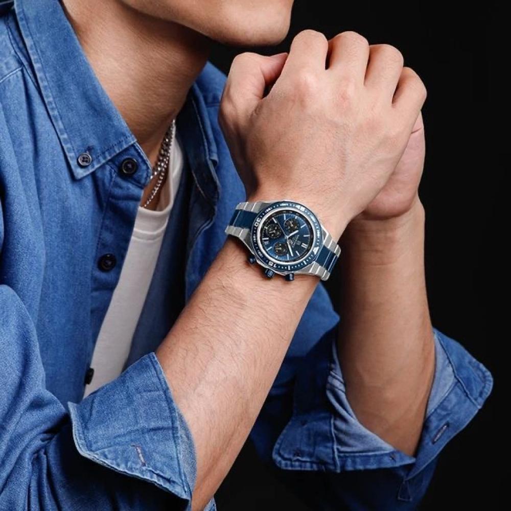 ساعة رجالية كرونوغراف فضي ميناء أزرق