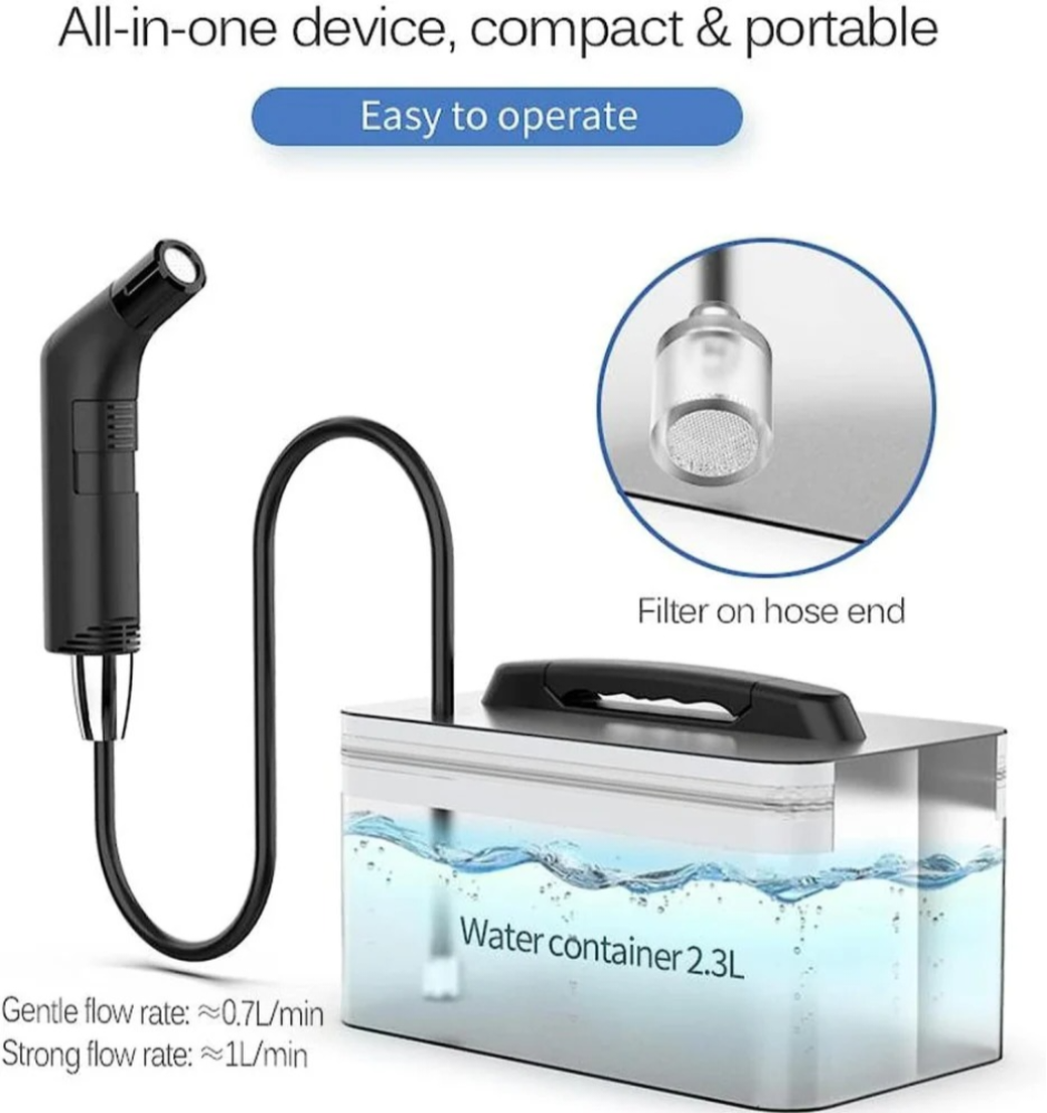 خزان مياه بسعة 2.3 لتر : يحتوي شطاف السفر على خزان مياه بسعة 2.3 لتر . هذا ما يكفي لتنظيف نفسك عدة مرات.