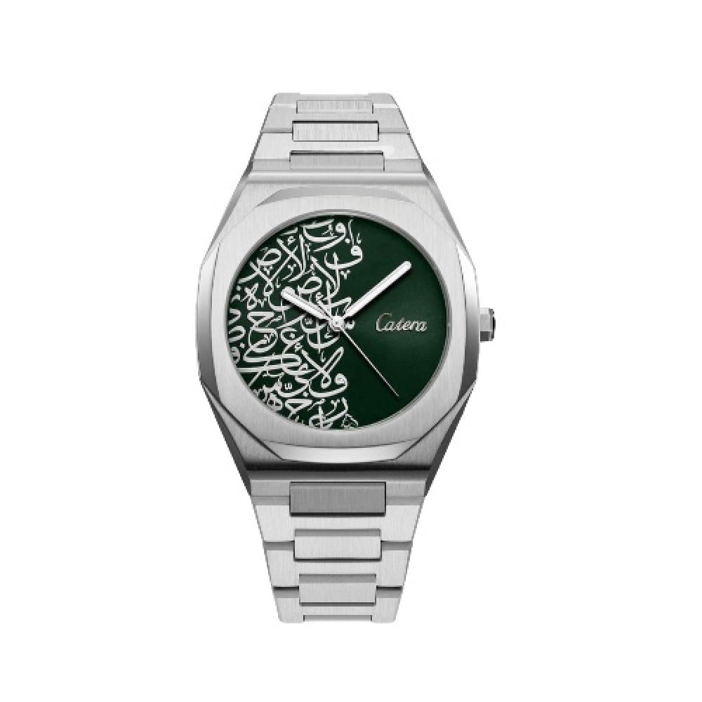 ساعه رجاليه فضي اخضر كاتبه عربيه